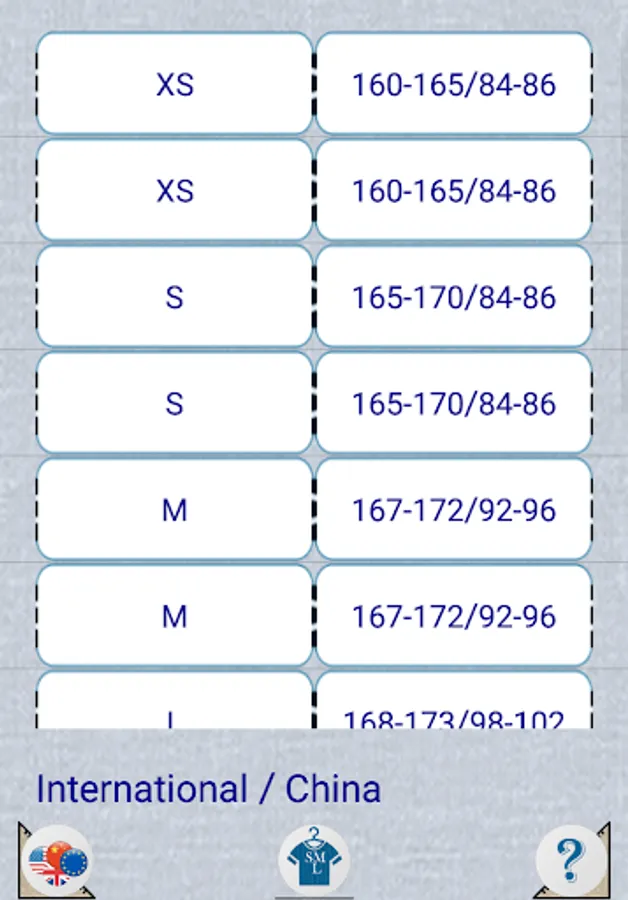- Clothing size conversion information for the UK, USA ,European,China Japan,Korea.