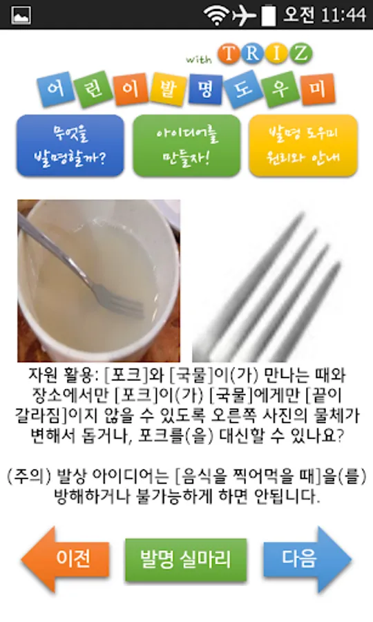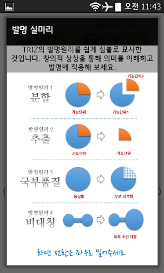 * Principle: The principle of the invention assistant is explained in detail through the "Principle and Guidance" menu of the app. Illustrate and illustrate the essential principles of TRIZ's invention process. If you are interested in TRIZ and invention, I highly recommend that you read this manual, which is equivalent to a 30-page booklet, at least once.