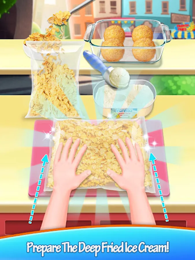 It’s new year Carnival time. Come on, let’s hang out to find something yummy to rock this year’s carnival. Ever thought of something to eat? How about snow cone? Corn dog? French Fries? Or something deep fried? Deep fried ice cream. OK, come on now, Let’s begin our carnival journey right now.