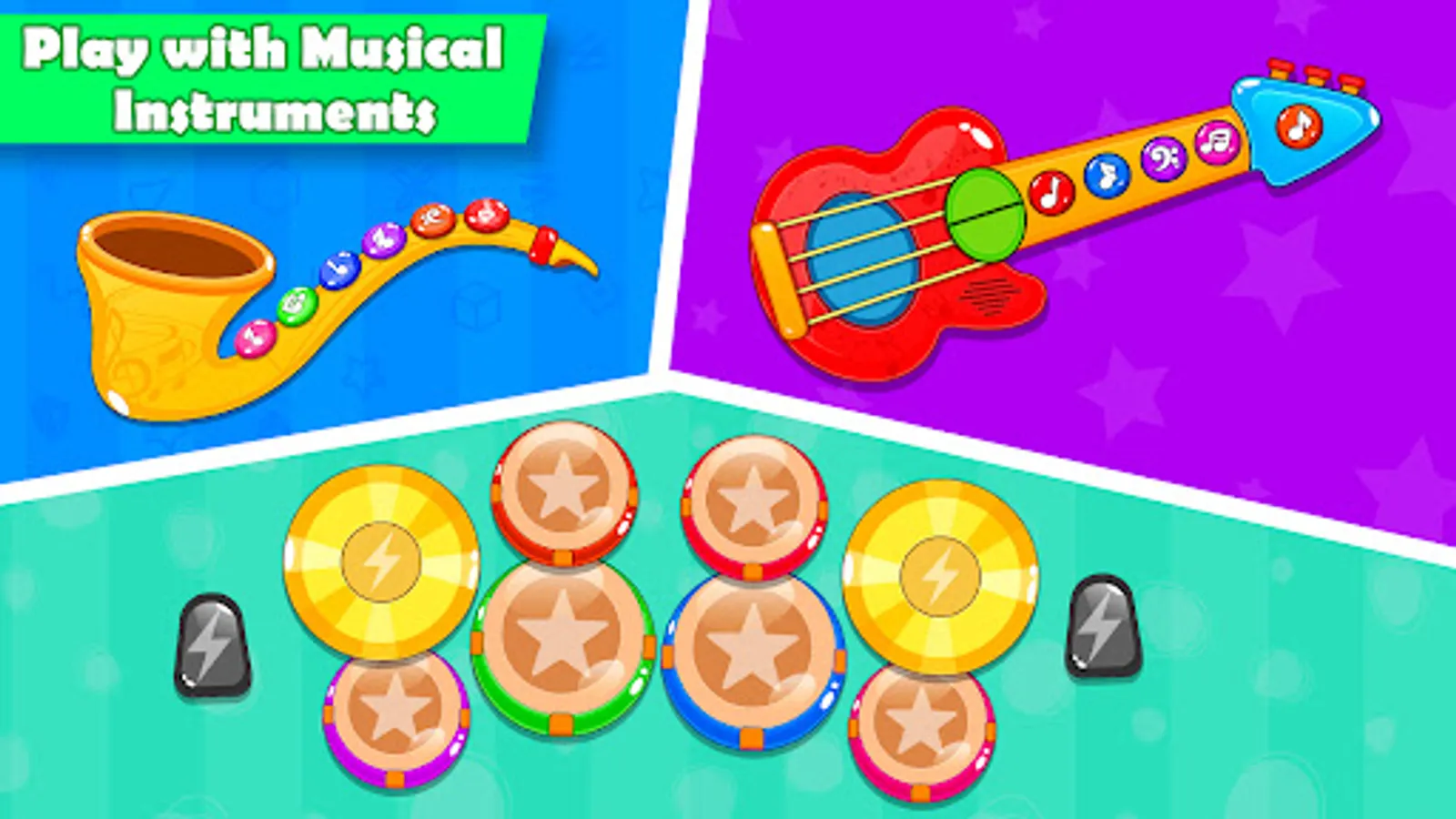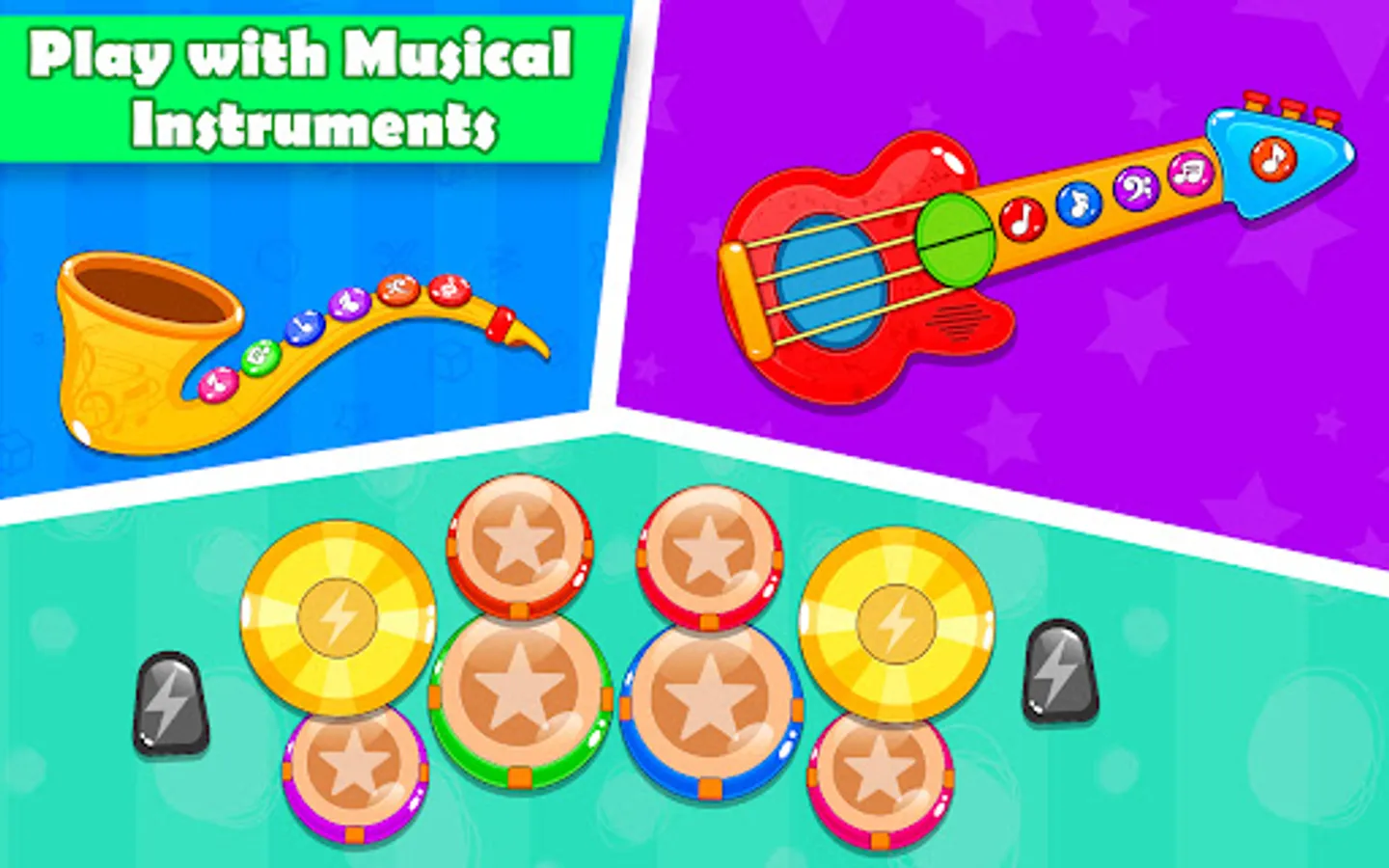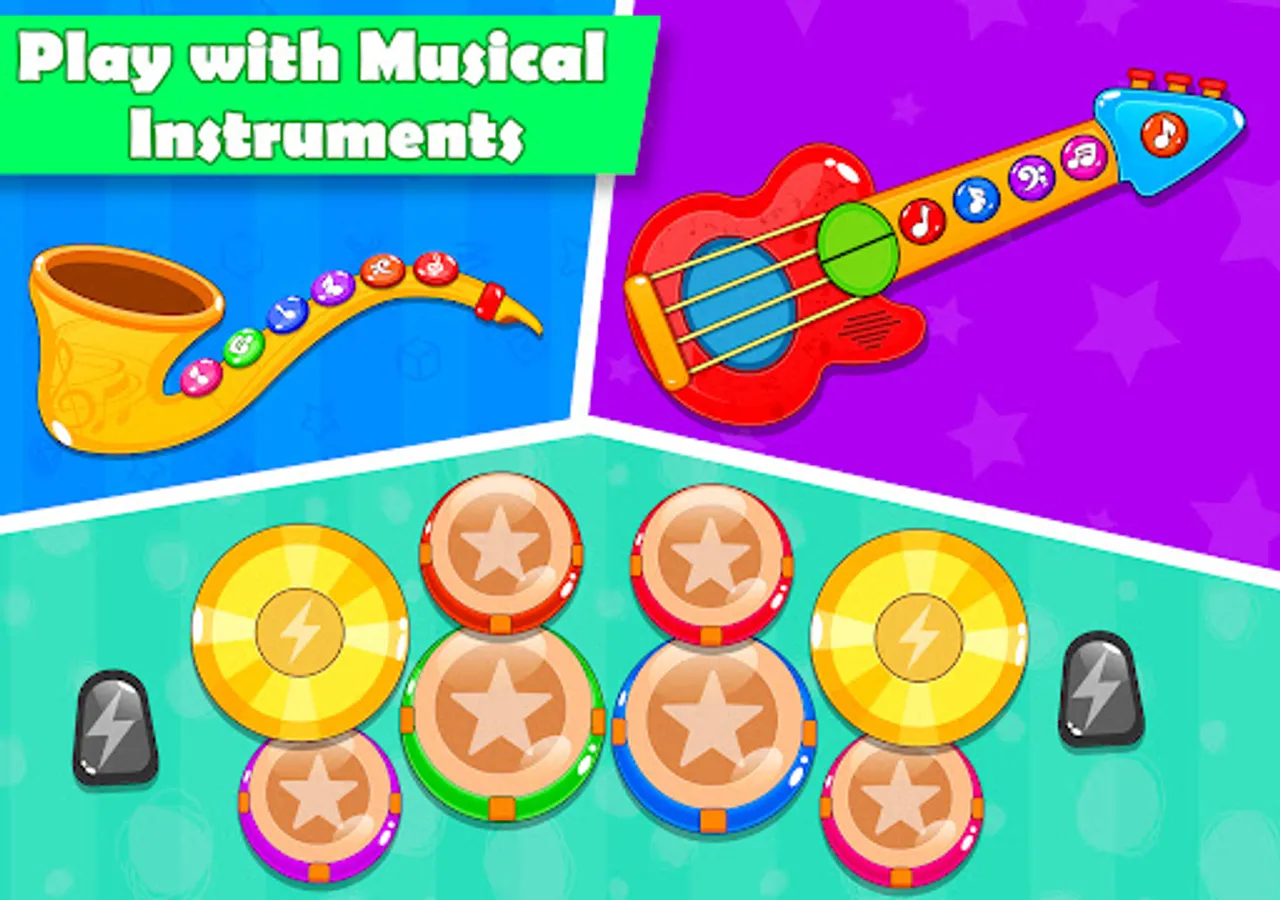 Instruments : Piano, Xylophone, Saxophone, Drums, Electric guitar, and Flute. Each instrument has real sounds and representation. The child can give free imagination to compose their own melodies in the different instruments.