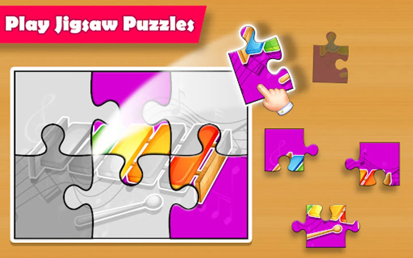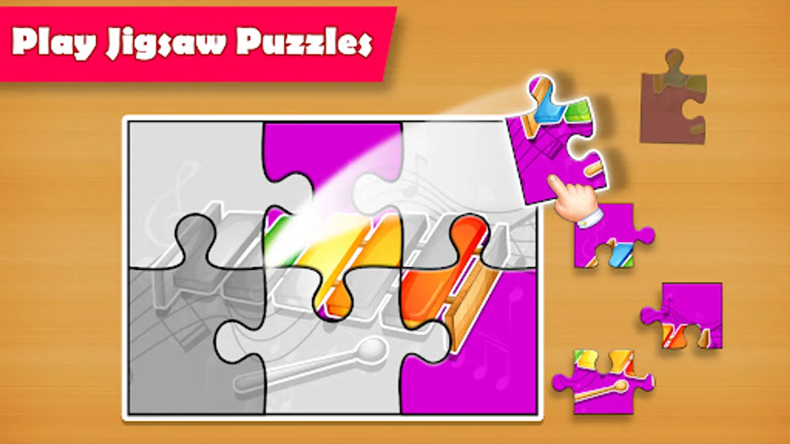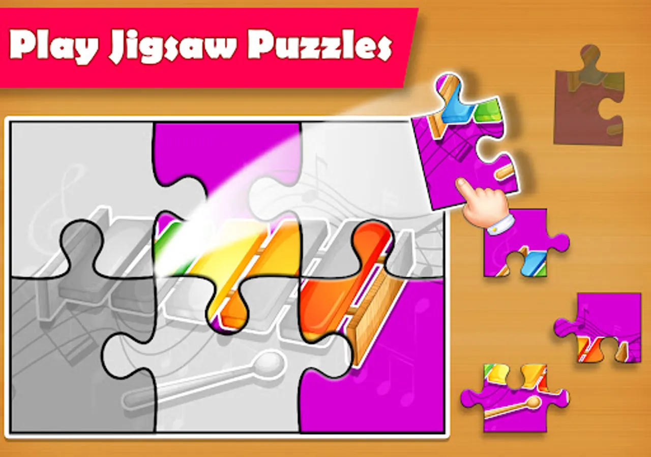Instruments : Piano, Xylophone, Saxophone, Drums, Electric guitar, and Flute. Each instrument has real sounds and representation. The child can give free imagination to compose their own melodies in the different instruments.