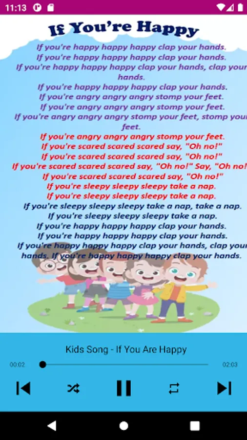 Singing and dancing while learning are at the heart of our app. Our songs teach about good habits, emotions, words, numbers, colors, always in a fun and entertaining way