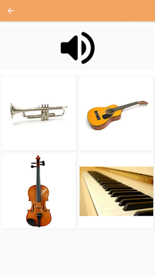 The kids app features two different ways of learning about music and instruments. First they can swipe through all the pictures of the instruments and pick the one they like to hear the name of the musical instrument and the sound. Then they can try the kids quiz to see if they can find the matching image of the instrument.
