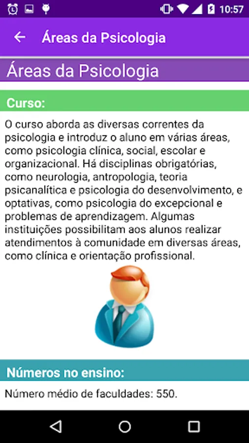 The application has a guide of the area for professional psychology, explanation of the psychology course, the stage, the areas to work and the psychology of the market as is currently, base salary and etc. in addition to the requirements of this area.