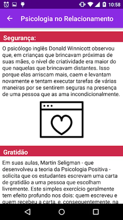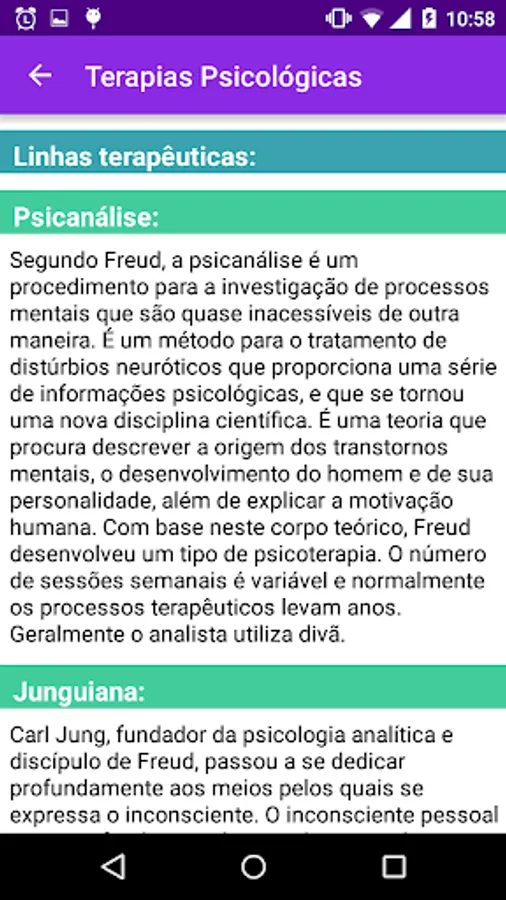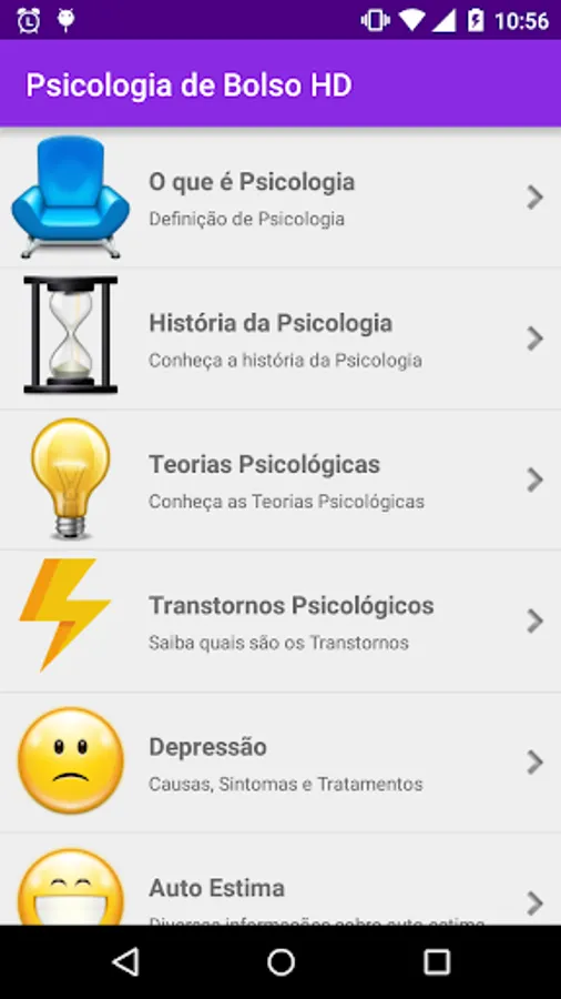 The pocket psychology application is a basic guide for anyone to know interesting facts about psychology. The application does not delve in the area, and also not suitable for treatments and professional use, it has only free and available to all organized in topical material, it is indicated for questions and curiosities about psychology.