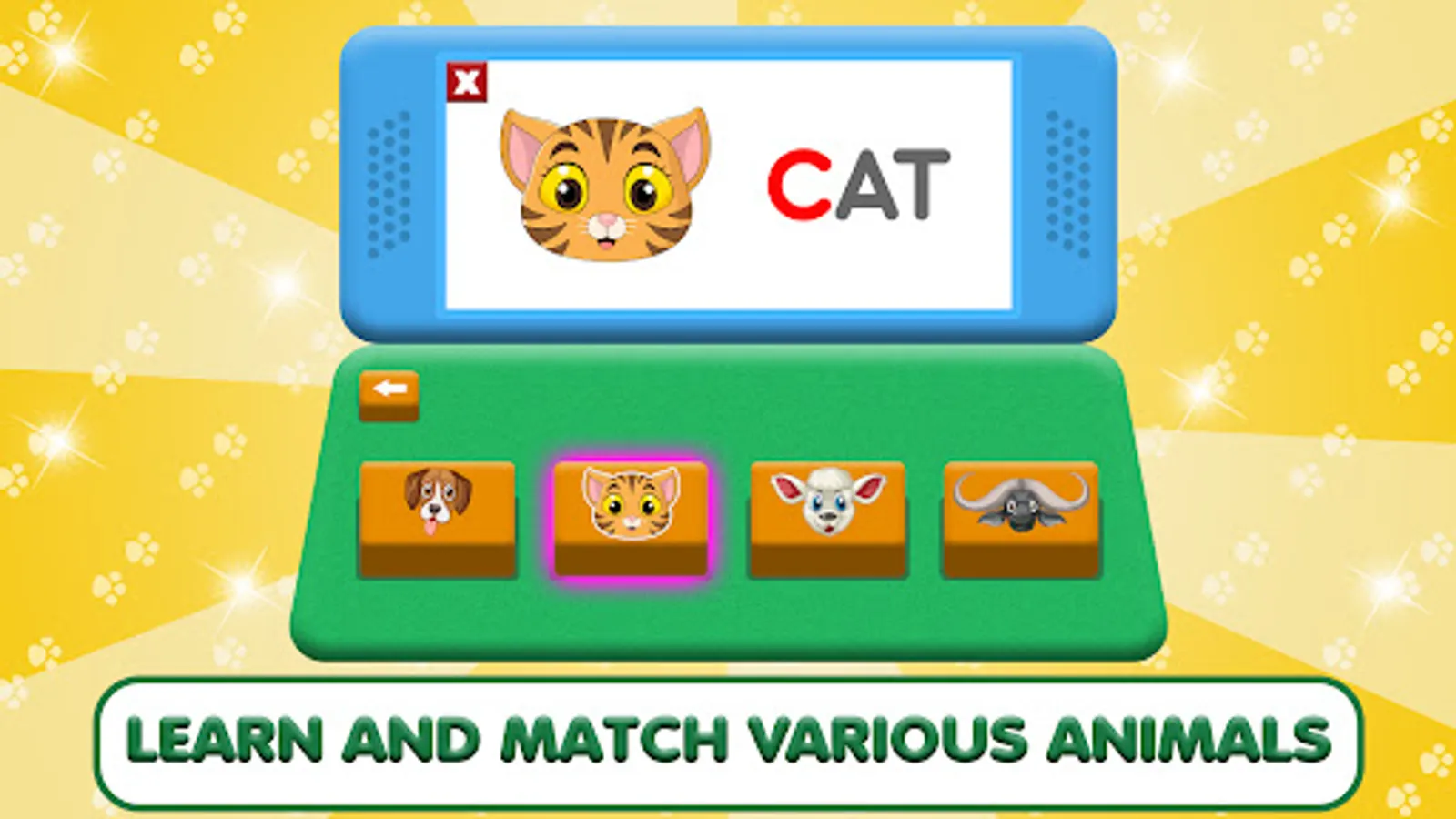 You can select the sound game and you will learn word and sound of the object that appears on the screen.