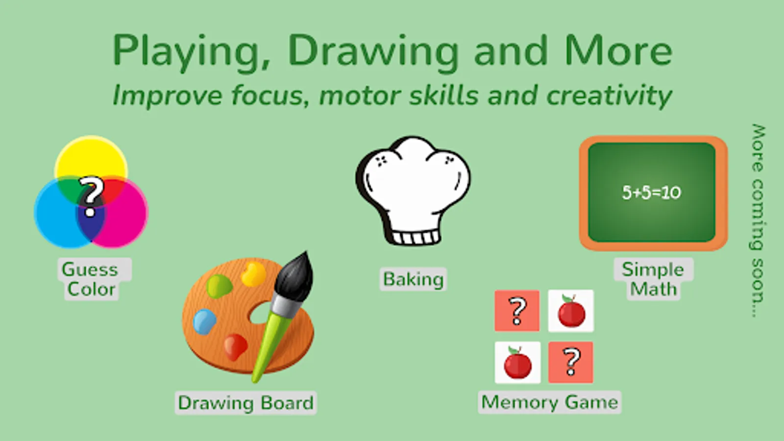 Enter the world of playing musical instruments, learning ABCs & basic math, and teasing the brain with memory games & puzzles- all in one place. Our app allows them to choose different mini-games where they can learn, practice and sometimes just have some fun.