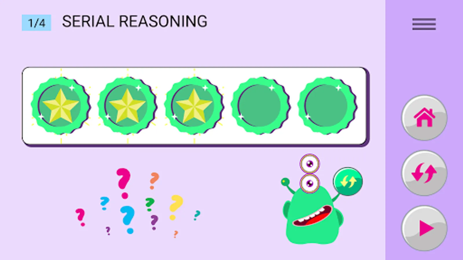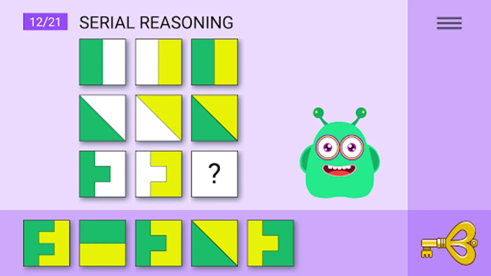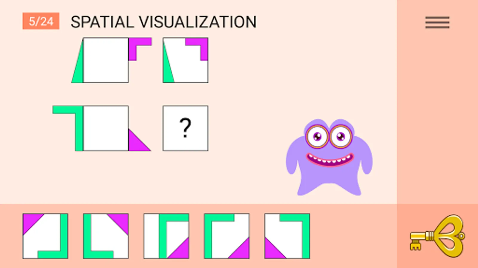 The KidyMindy app is aimed at developing the spatio-visual, logical, and critical thinking of children aged 6 and older, and it may also be of interest to adults. It presents visual, non-verbal tasks based on abstract shapes in a playful format. Our approach does not require the user to have reading and conversational skills, and this makes KidyMindy culturally neutral and language-independent.