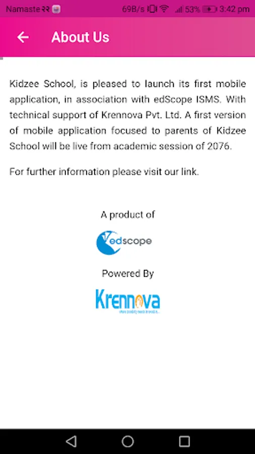 edScope is a complete, fully customisable Integrated School Management System (ISMS), ideal for schools, colleges and educational Institutes. With technical partnership with Krennova Pvt. Ltd; Kidzee School has customised edScope ISMS’s functions and features to cater its unique need. It has an intuitive and powerful interface that requires little training and ensures appropriate flow of information and functions to all members of the school community, including school administrators, school management, academic staff, student, and parents.The first version of application targeted to Kidzee’s parents will believe from academic session of 2076, with following features and functions-Students profile-Health and fitness reports-Exams and results details-Notices of events and functions-Fees details -Feedback and suggestion. Kidzee School is working with its technical partner to improve the digital platform for its students, parents, teacher and community. The mobile application will be enhanced and upgraded as per the need and suggestion of its stakeholders and will focus on bringing new features and function in near feature.