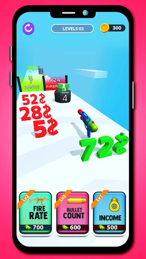 In this money merge shoot game, You have to collect guns and shoot the money digit along the way to increase and decrease the green and red digits and merge them to increase your money value and at the end shoot obstacles to collect more money and become the best money shooter.