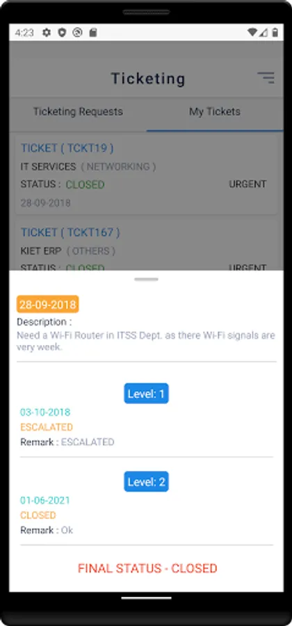 The employees can also post their complaints or suggestions using the ticketing system which is reviewed by appropriate authority and action is taken regarding it. Student Redressal system is also provided in this app using which user can reply to the grievances posted by the students of KIET. With regular notifications, the user will be updated with every activity performed in college.