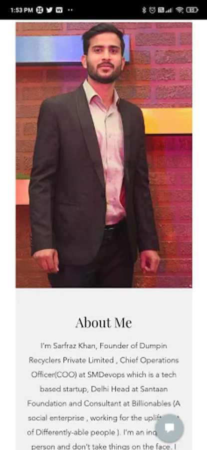 Sarfraz has come a long way due to his dedication and hunger for success. His hard work has paid off really well. All the consistent efforts and his commitment to his work have made him touch soaring heights in a very young age. He works with international brands and also provides consulting to anyone who seeks guidance. Today he has many official titles to brag about Viz. the Founder of Dumpin Recyclers Private Limited, which is a recycling company; working as COO (Chief Operations Officer) at SMDevops, which is a tech-based startup; posted as the Delhi Head at Santaan Foundation and a Consultant at Billionables.
