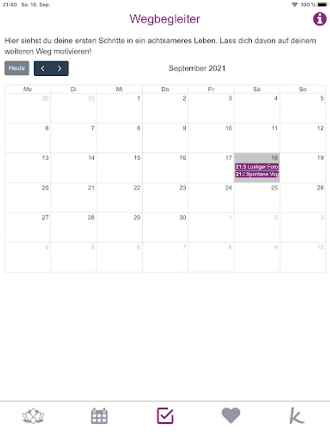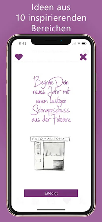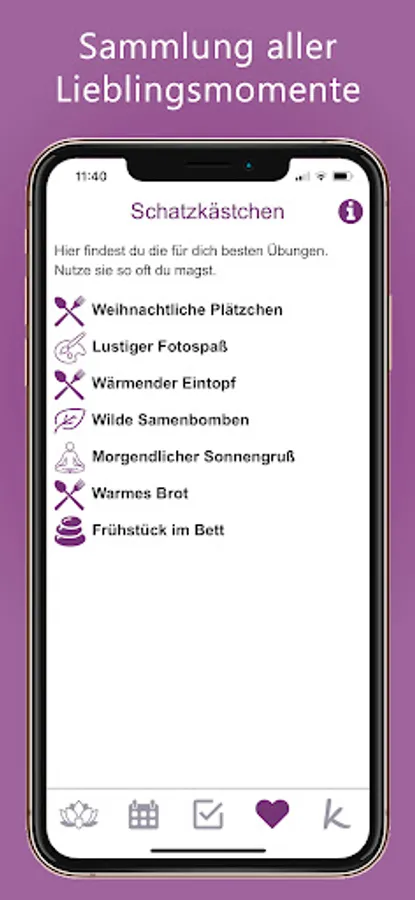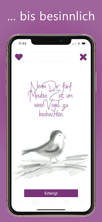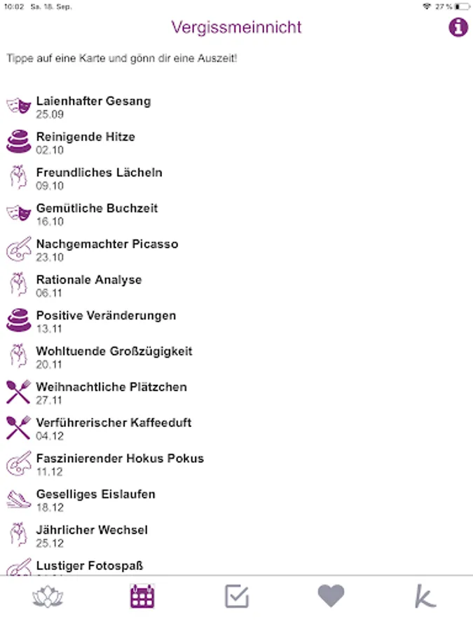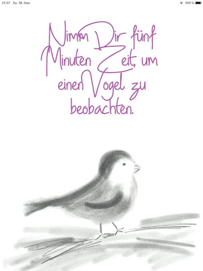 Whether shorter or longer - once a week you will receive a new mindfulness exercise. The 52 ideas behind it are also very different and can be roughly classified into 10 sub-areas: creativity, cultural techniques, meditation, nature, personal development, recipes, self-organization, social development, sport and wellness. There is something for everyone and some things are definitely unfamiliar. But it's worth trying! Give yourself a week to practice. Then you mark your little break in the motivation calendar and you can decide whether it will even make it onto your favorites list. In this way, you can create an individual repertoire of ideas over time and by the way, which you can refer to on a regular basis.