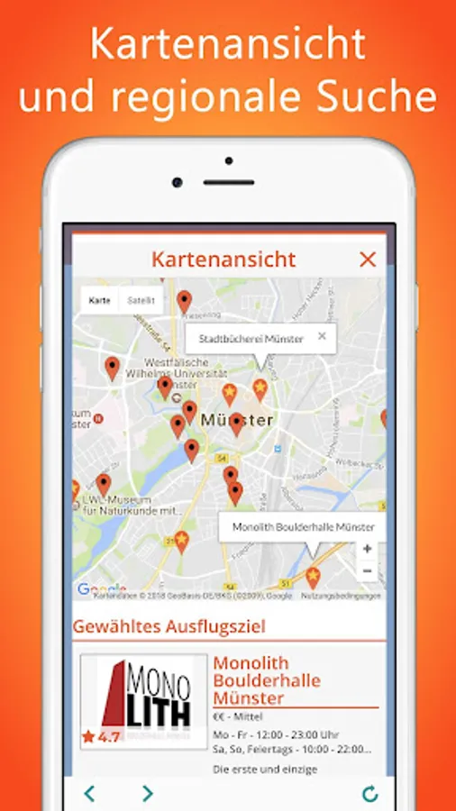 The locations can be filtered according to different criteria. Are e.g. only swimming pools interesting or should it rather be something culture? Maybe you are just looking for an exciting enterprise for boring rainy days?
