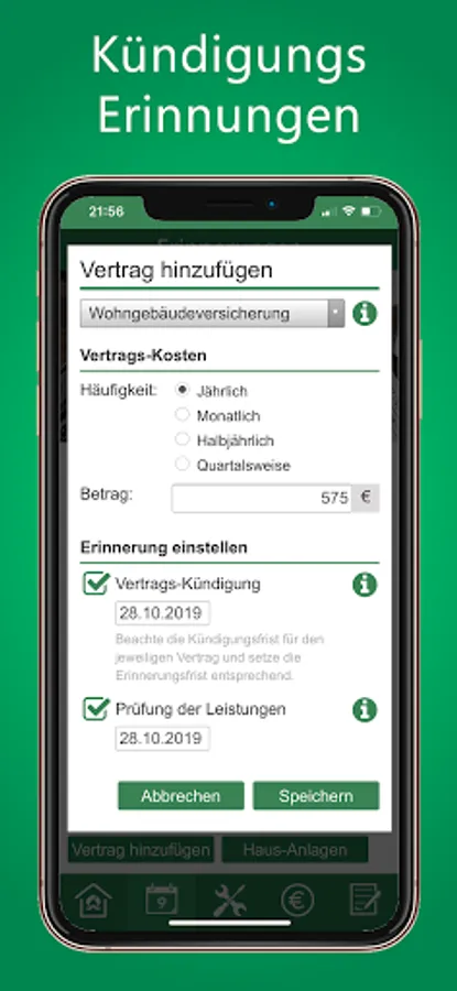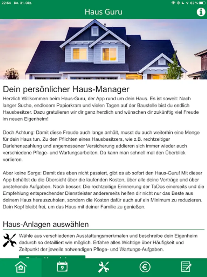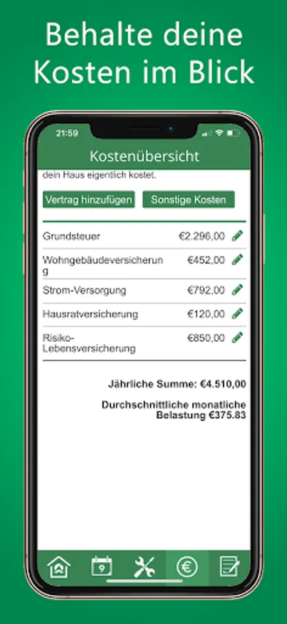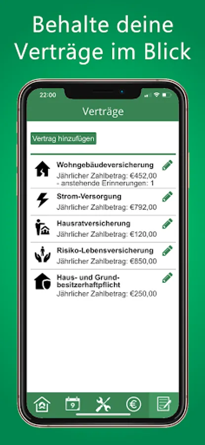 With this app you get all the relevant help to manage your home optimally. It sensitizes you to necessary care and maintenance tasks, supports you in managing the contracts and enables you to keep track of costs. This is how home ownership is fun!
