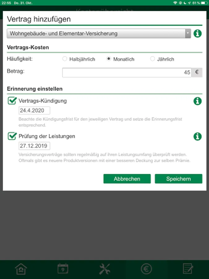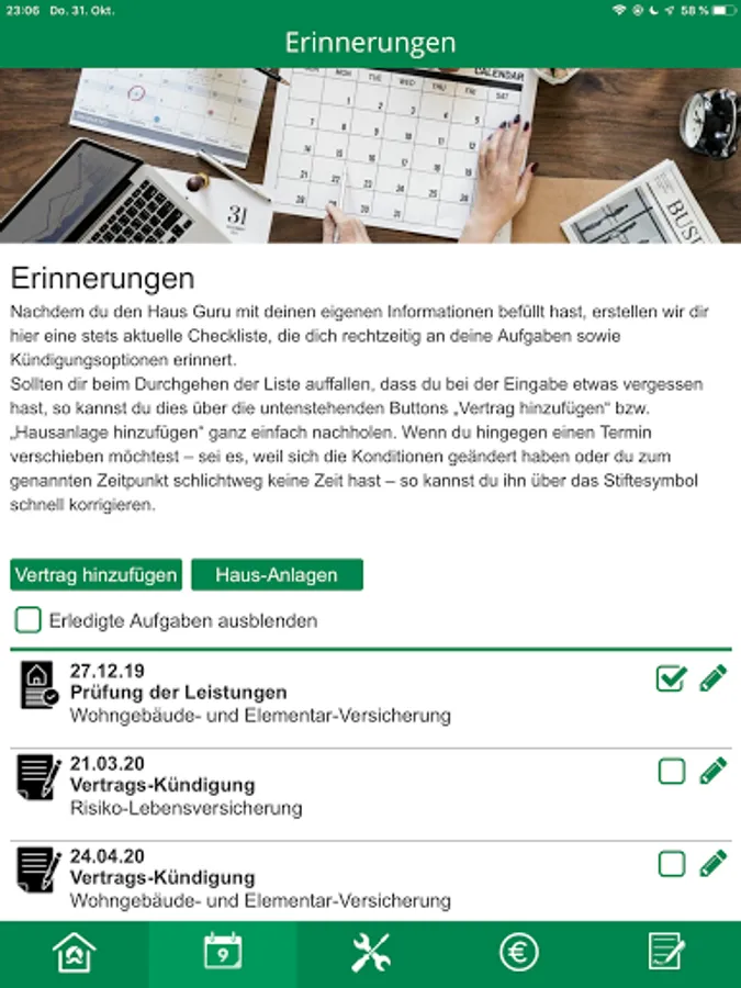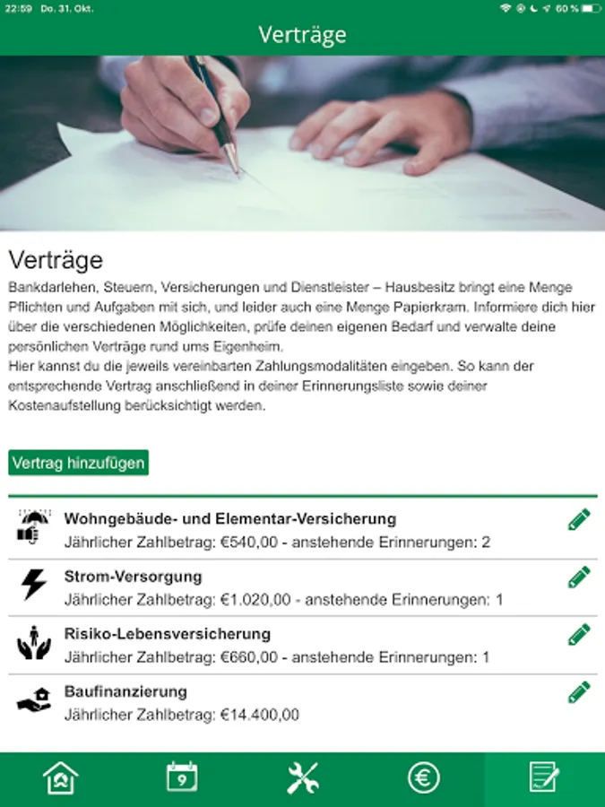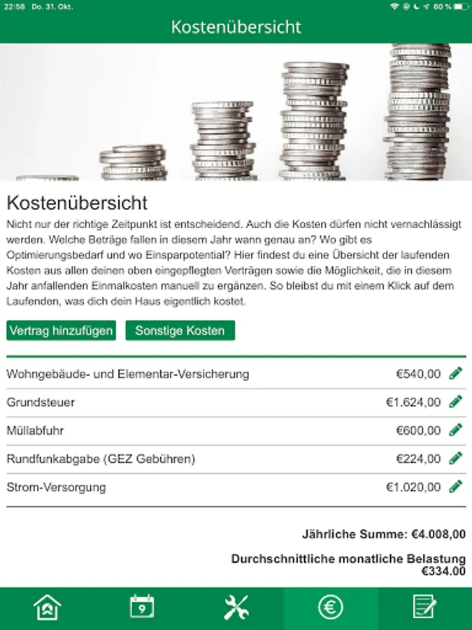 By adding to the relevant contracts in the Contracts tab, you can find out whether you are meeting all the duties and needs relating to the house and garden. Otherwise, in addition to information on tasks, contribution payments and termination options, we will also be happy to include a reminder to conclude a contract in your checklist. In combination with the Costs category, which shows you the amount and time of all house costs incurred in the current year, you will always be up to date and will certainly discover one or the other saving opportunity. Just try it out!