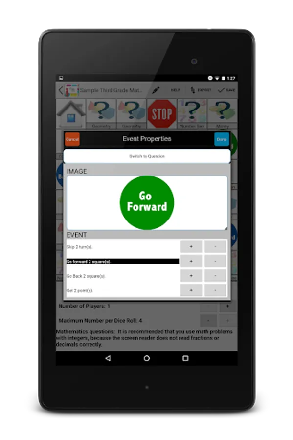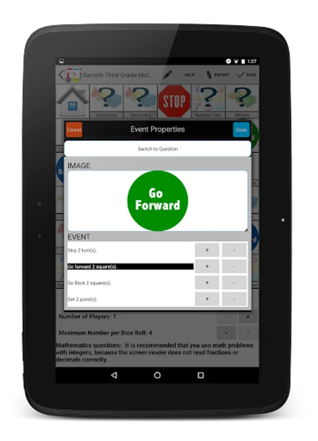 Description: Make & Play Quiz allows teachers to design their own unique board game or "quiz", where students can learn or strengthen their skills by playing a game. Each square can have a Question (Multiple Choice, Fill in the Blank or True/False) or an Event (Stop-skip turns, Go forward, Go Back or Get Points). One to four players can play at a time and the games can be shared with others.