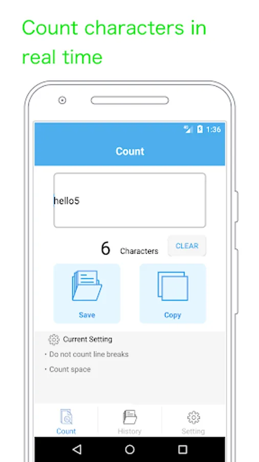 In the character count screen, pressing the save button saves the entered text.