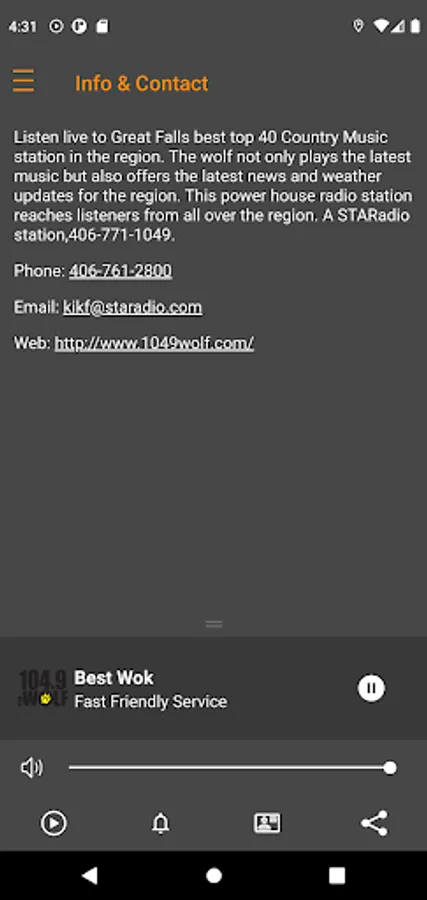 Listen live to Great Falls best top 40 Country Music station in the region. The wolf not only plays the latest music but also offers the latest news and weather updates for the region. This power house radio station reaches listeners from all over the region. A STARadio station,406-771-1049.
