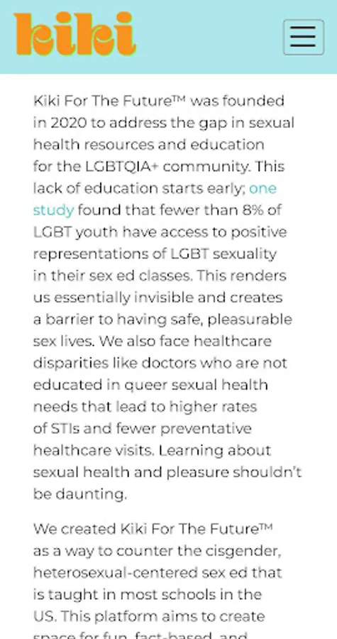 We created Kiki For The Future™ as a way to counter the cisgender, heterosexual-centered sex ed that is taught in most schools in the US. This platform aims to create space for fun, fact-based, and easy-to-understand discussions about sex. For the newly out to the old pros, for everything from basic anatomy to butt plugs, Kiki For The Future™ is about inclusion for all. All genders, all sexualities, all types of sex and relationships.