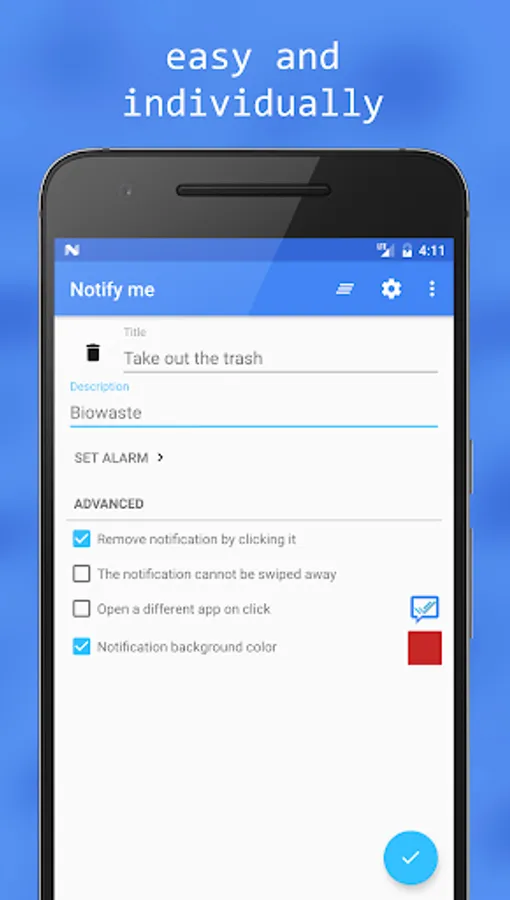 The icon can remind you of the task even without reading the title or description of the notification. If you have to write an e-mail you can chose to open the e-mail app when clicking on the notification. And if the app should remind you of taking out the trash this evening you can set an alarm.