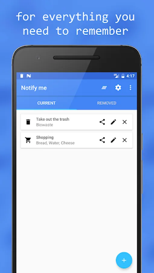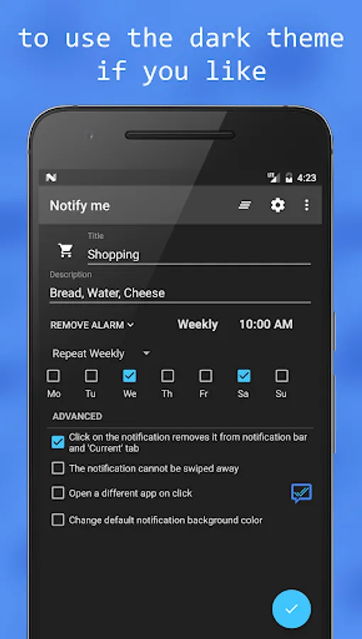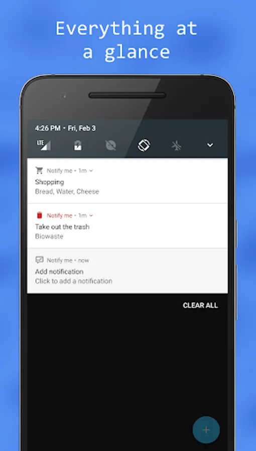 Instead of opening apps or looking for widgets like necessary in many To Do List Apps, you can not overlook the notifications in the notification bar (status bar). You will see the reminders every time you are looking on your phone, so that you will not forget your tasks, dates, meetings or whatever.