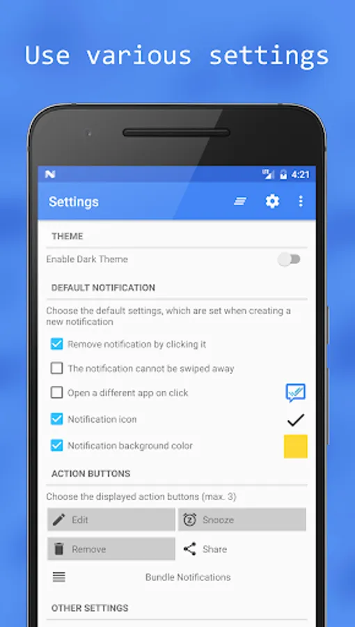 - Numerous Action Buttons for the notification (Snooze reminder, Bundle notifications,...)