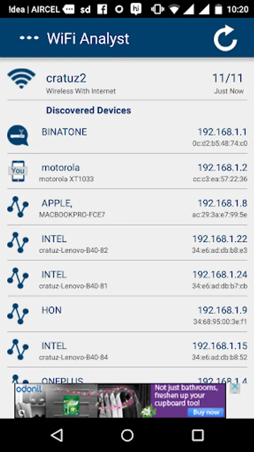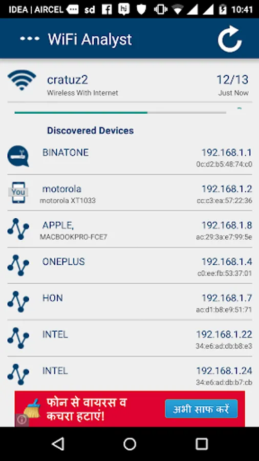 • WiFi Analyst help you to see all the devices connected to network , giving relevant data such as IP address,