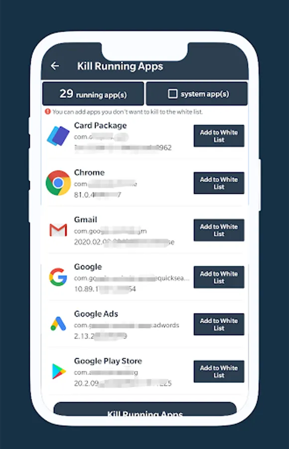 The White list feature is useful. Apps in the White list won't be killed. so If you don't want to kill some apps, you can add them to the white list.