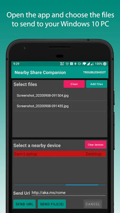 The app uses Windows 10 built in function to share files.