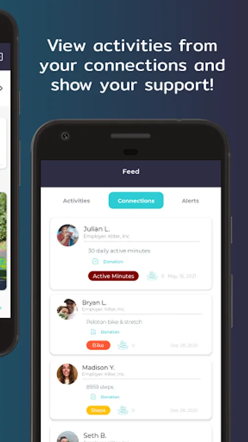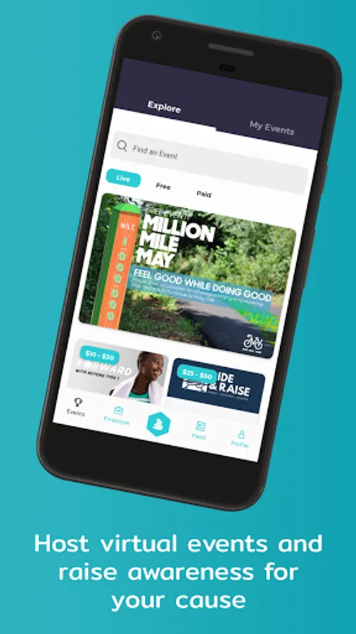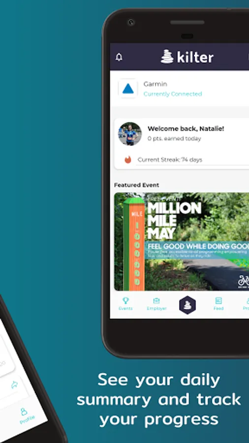 The free Kilter app allows you access to a number of different event programs: Non profit-hosted events, corporate donation matching, team-based company challenges, and virtual races & marathons.