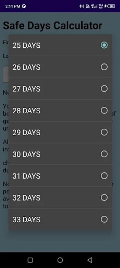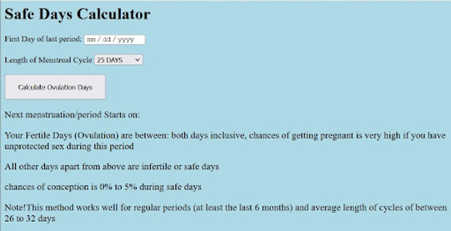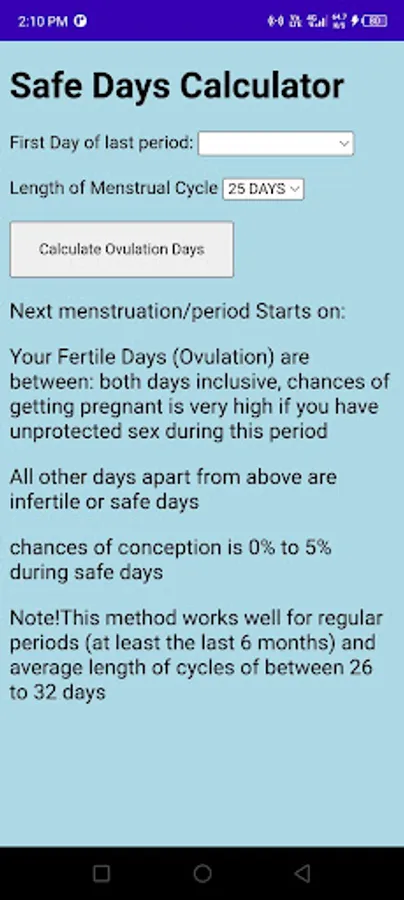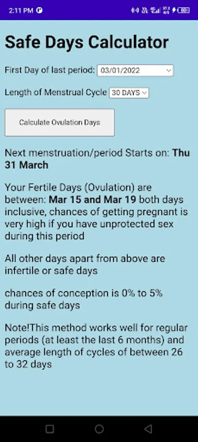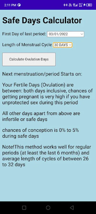 The safe days calculator II is a successor of the first app, it helps you to calculate the safe period or infertile period between your or your partner's last menstrual cycle. This is to avoid unplanned pregnancies and also to know when to get pregnant.