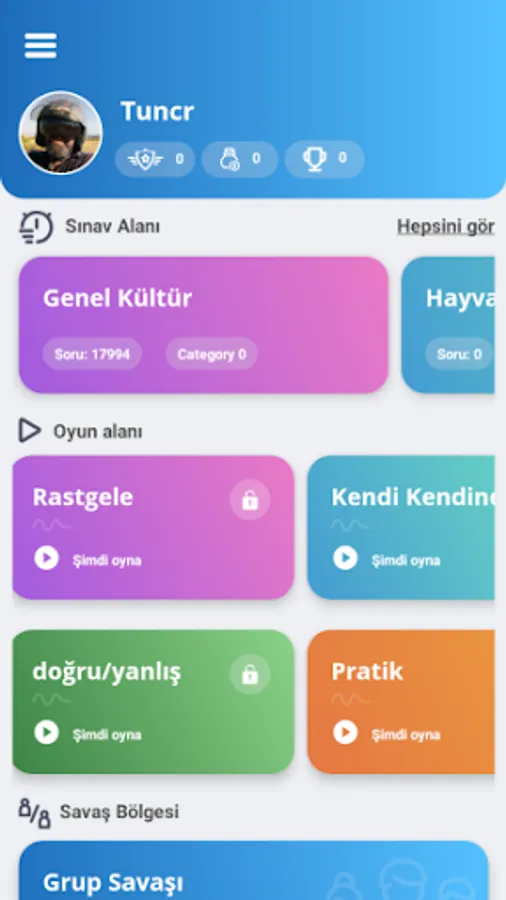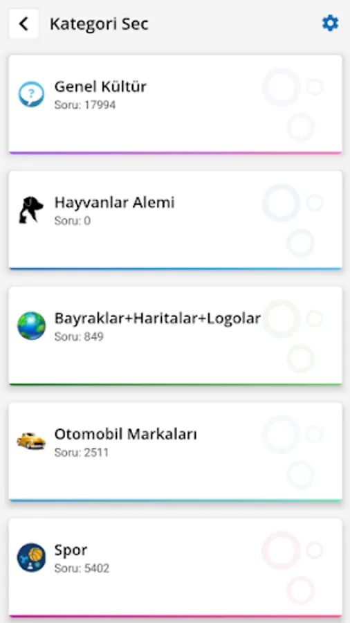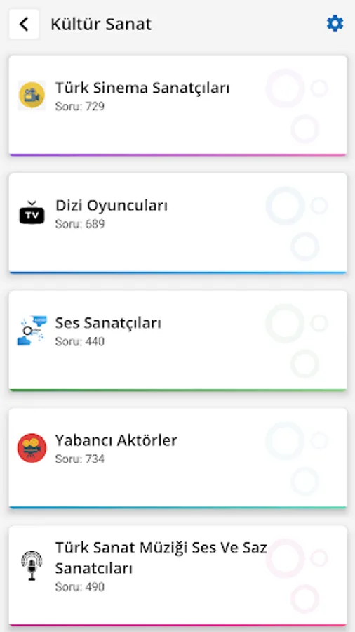 1. general culture 2. ancient language 3. Music 4. Sports 5. Religious knowledge 6. automotive 7. Geography 8. History 9. Literature 10. Cinema