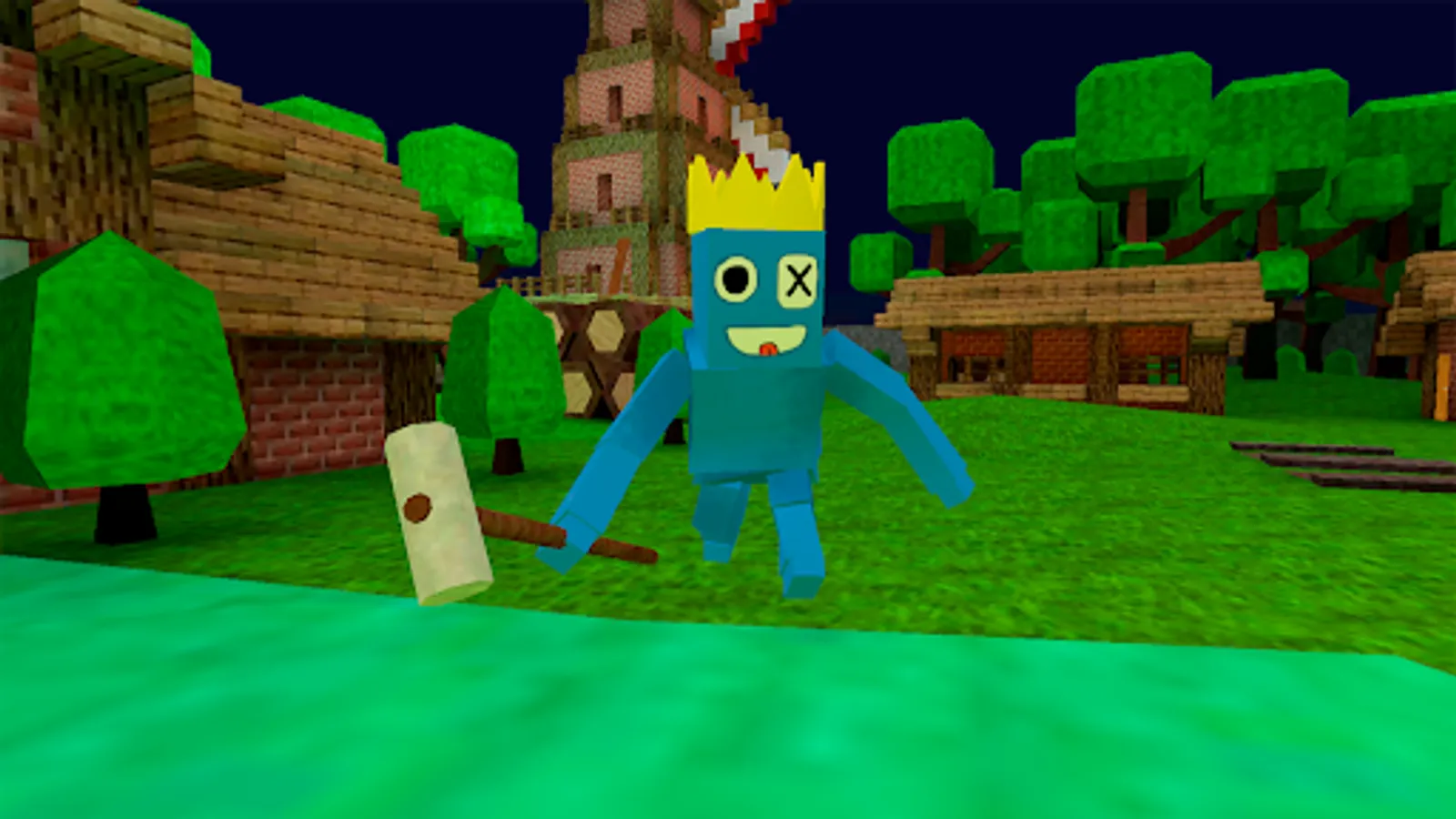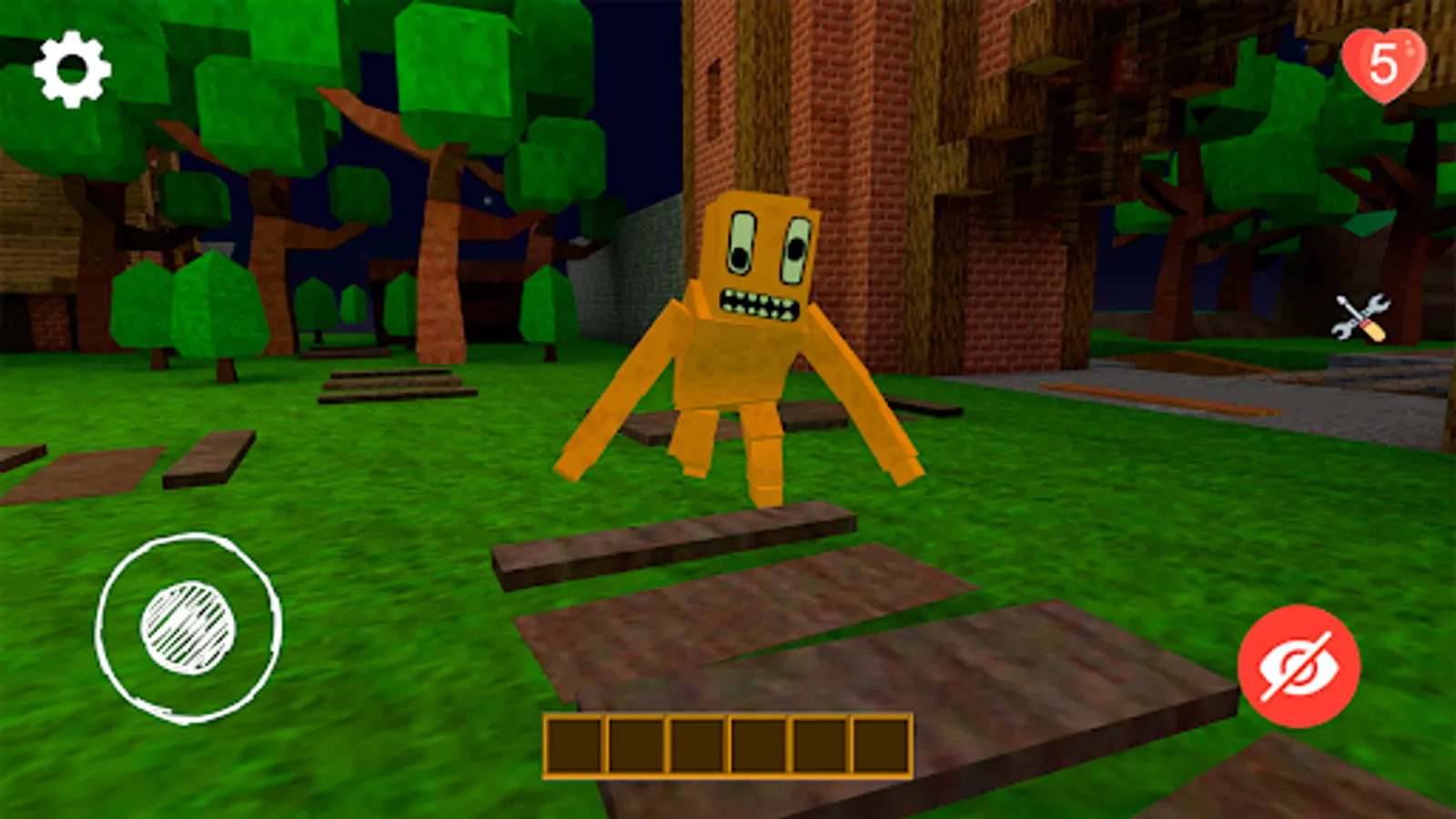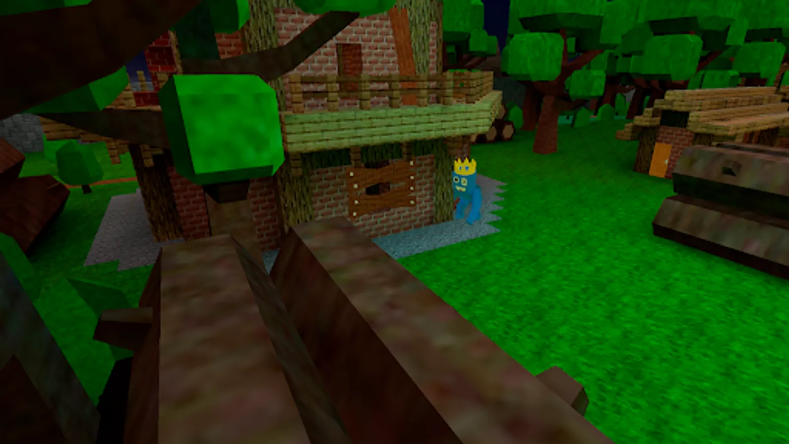 You and your friends will be on the map. When the game begins, try to explore the map and visit different places in order to find wood boards and other valuable things that will help you arrange an escape. Try to sneak into the house of the rainbow granny and search for different secrets. Perhaps you will find keys or useful tools. You can climb onto the tower to look at the map details from up high.