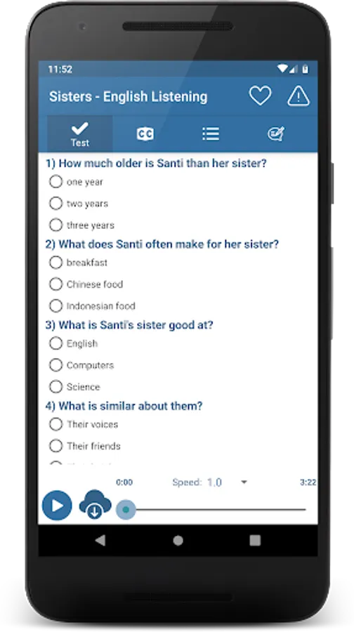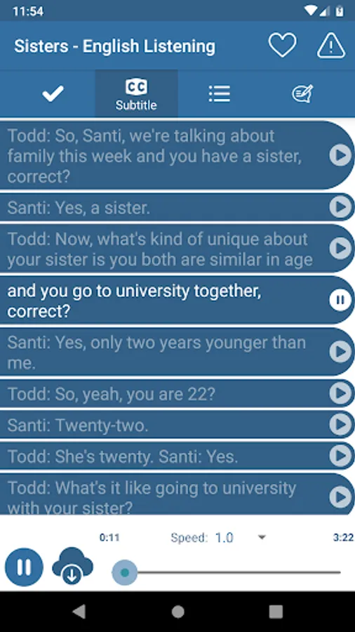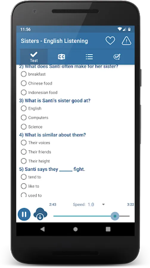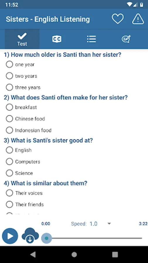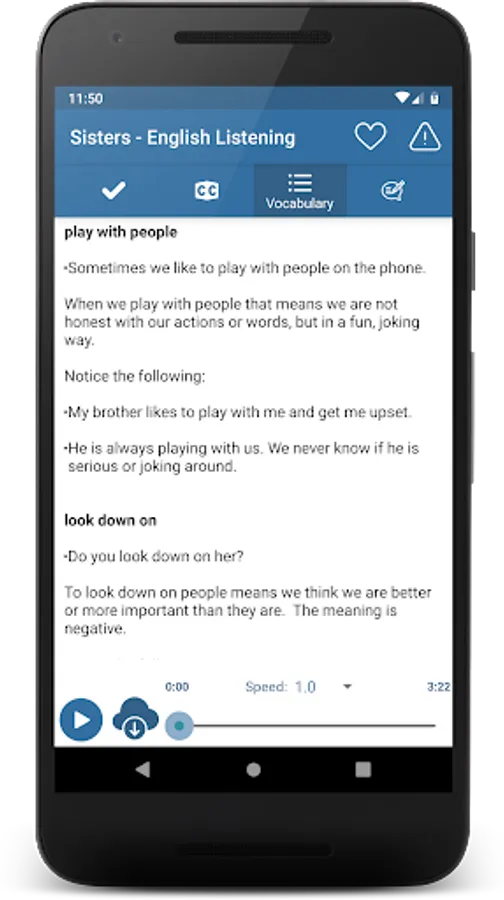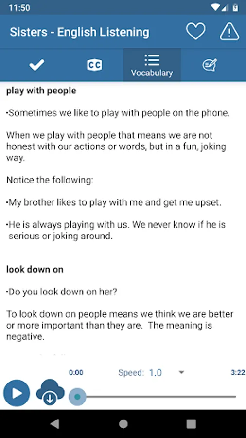 "English Listening & Speaking" is a free application for listening to speak English. In "English Listening & Speaking" all the articles are categorized and divided the level, which means that you can easily start your listening English practice from the level you’re comfortable in and work your way through the more advanced level articles and conversations. With preset scenarios that cover almost all the aspects of the daily lives, you will soon find the results of listening English practice effectively affecting your English listening and speaking skills.