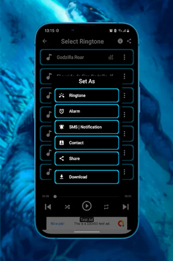 Hello, welcome to the Godzilla Roar app! This app is designed so that the user enjoys a comfortable and simple template and thus can get the most out of his interest, in this case THE BEST RINGTONES OF THE KING OF THE MONSTERS, GODZILLA.
