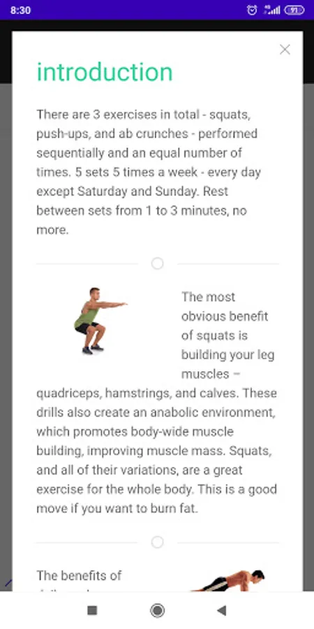 A total of 3 exercises - squats, push-ups and abs crunches - are performed sequentially and an equal number of times. 5 sets, 3 times a week (Monday - Wednesday - Friday or Tuesday - Thursday - Saturday). Rest between sets for 1 to 3 minutes (depending on your feeling), no more.