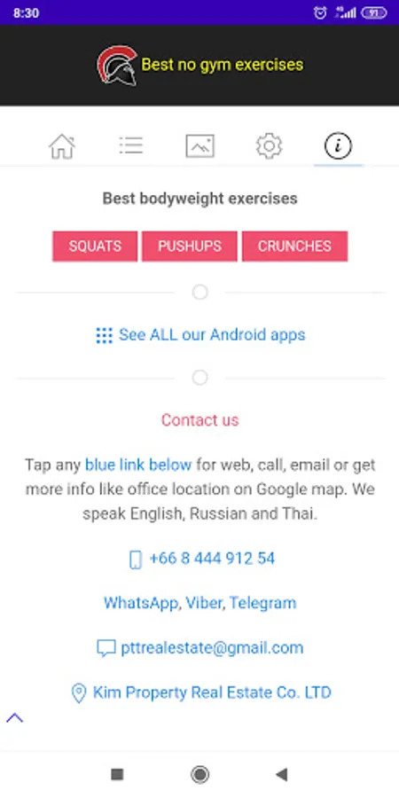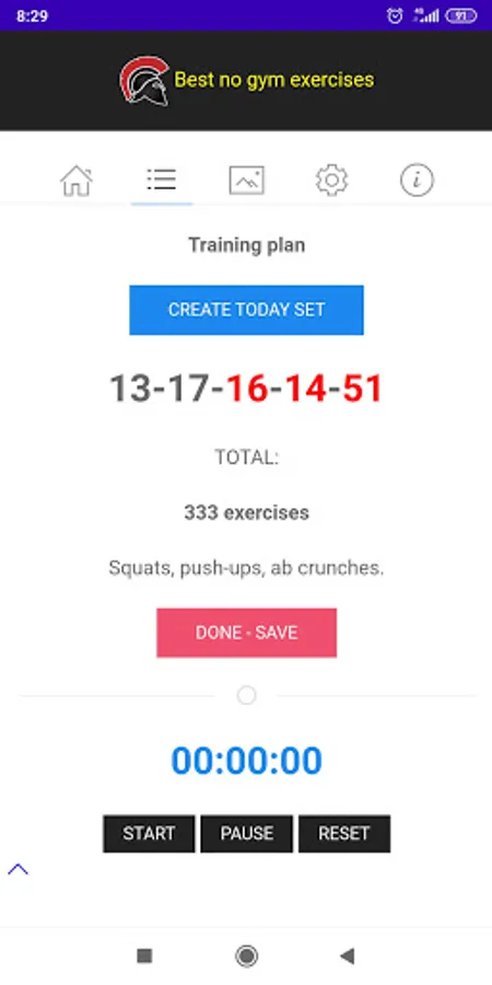 The application takes into account your initial level, draws up an individual program and tries to bring your to peak form in 18 workouts (6 weeks, one and a half months).