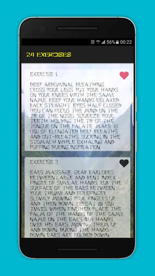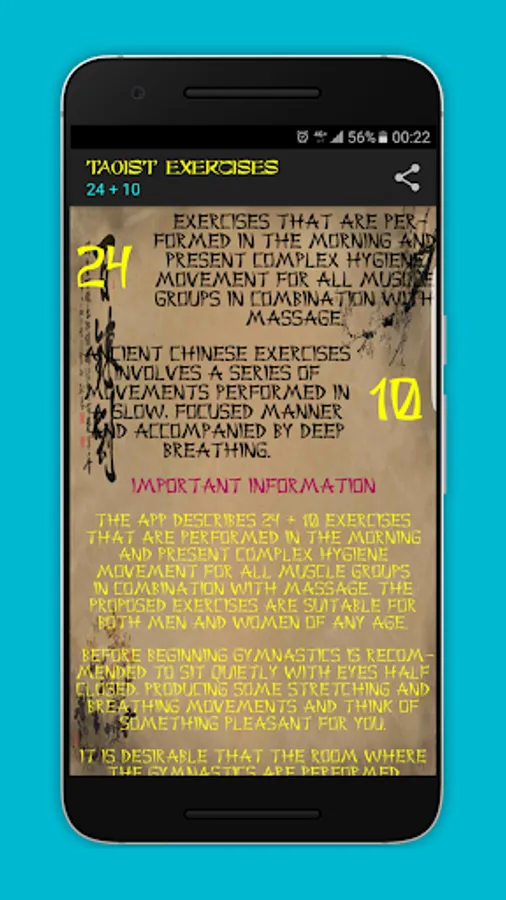 The app describes 24 exercises that are performed in the morning and present complex hygiene movement for all muscle groups in combination with massage. The proposed exercises are suitable for both men and women of any age.