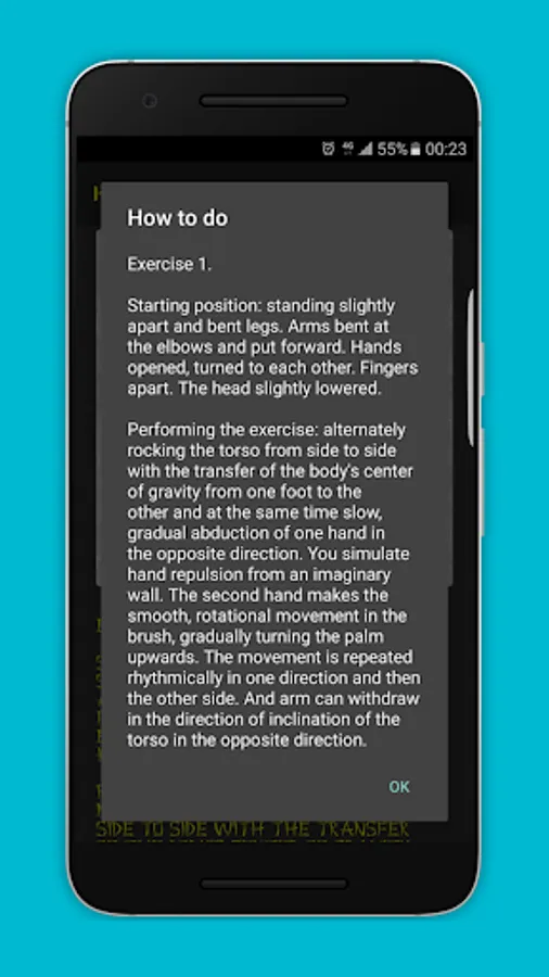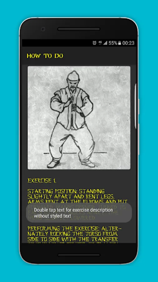 Double tap stylized exercises description if it's hard for you to read text. You will see message box with normal text or voice message.