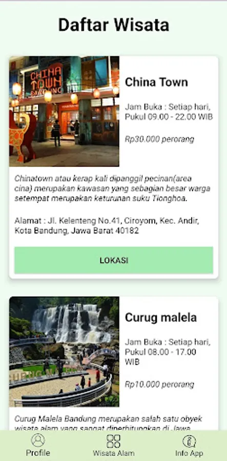 Hi, introduce me to the "Going Tour" application. I am here for those of you who want to take a vacation to tourist attractions in Greater Bandung. Relax, you don't have to worry about getting lost because in this application there are maps of locations to tourist attractions. Information related to tourist attractions consists of descriptions, entrance tickets, and details.