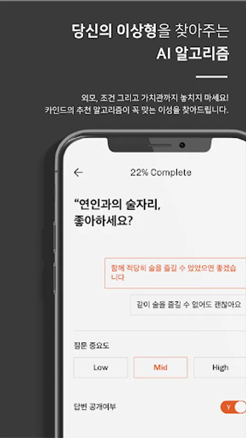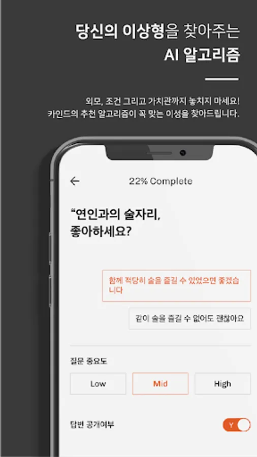 Don't miss out on any of your appearance, condition, and values. Kind's recommendation algorithm will be the most reliable broker. Please set your own tastes and preferences. AI analyzes your desired appearance, ability, personality, etc. to define your ideal type and finds the right person for you based on extensive data.