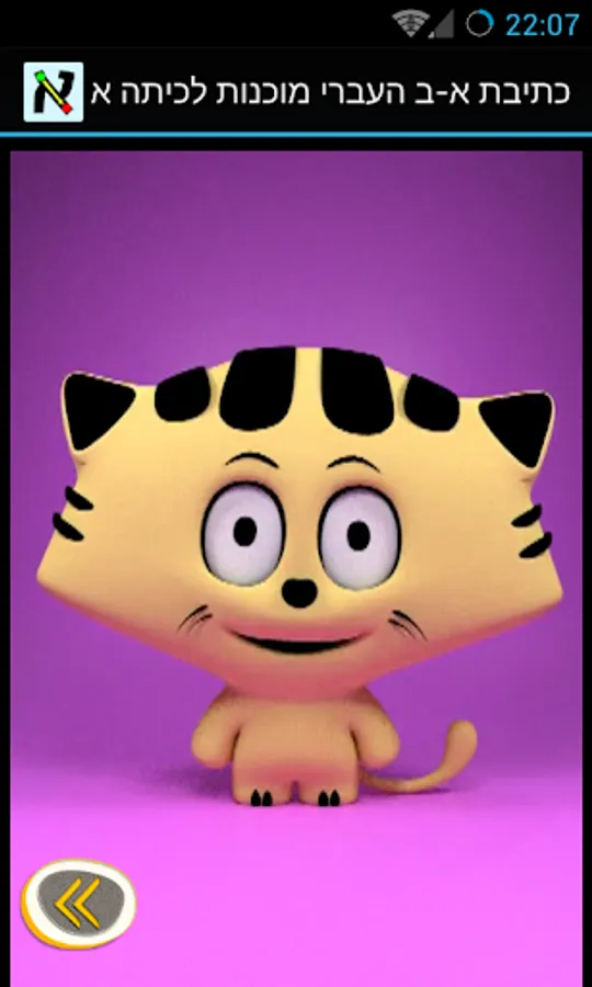The application is built in the style of dialogue with cute kitten that appears at the beginning and explains how to use the application as a child. At the end of each letter writing, there is a picture of an item whose name begins with the letter practiced. The application moves automatically between letters when writing the letter completes successfully. During a session of the kitten appears and encourage your child to continue learning, in addition to short effects are entertaining the child.
