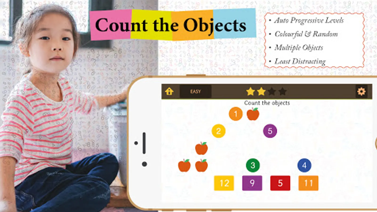 This activity exercise is more like a small quiz to the kids who have already known a bit of numbers and memorized their shapes. Random number of objects are shown in the screen and a few options are provided. The kid tap the right answer and the level of difficulty increases gradually. This activity is specifically designed for the kids aged 3 - 5 years.