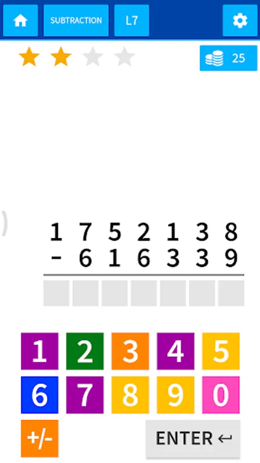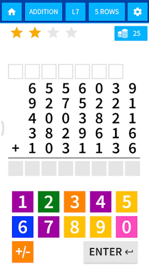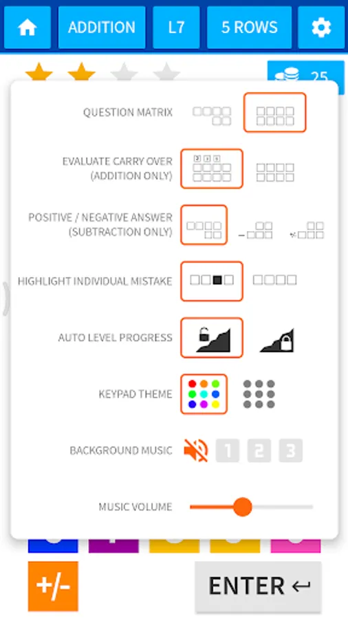 The questions are generated randomly so that the kids almost always find a different question except for the first level which is limited to initial digits. The question matrix starts from easy 2 digit calculation and grows up to a grid of 5×7 (5 columns & 7 rows).