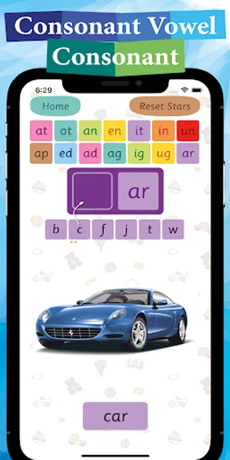 The app is very simple to use. It starts with one of 14 provided categories (Collection of AT, OT, ED Words etc) with a basic animation about how A & T combines to form “AT”. Below you can find the possible letter combinations for drag and match to form the CVC word.