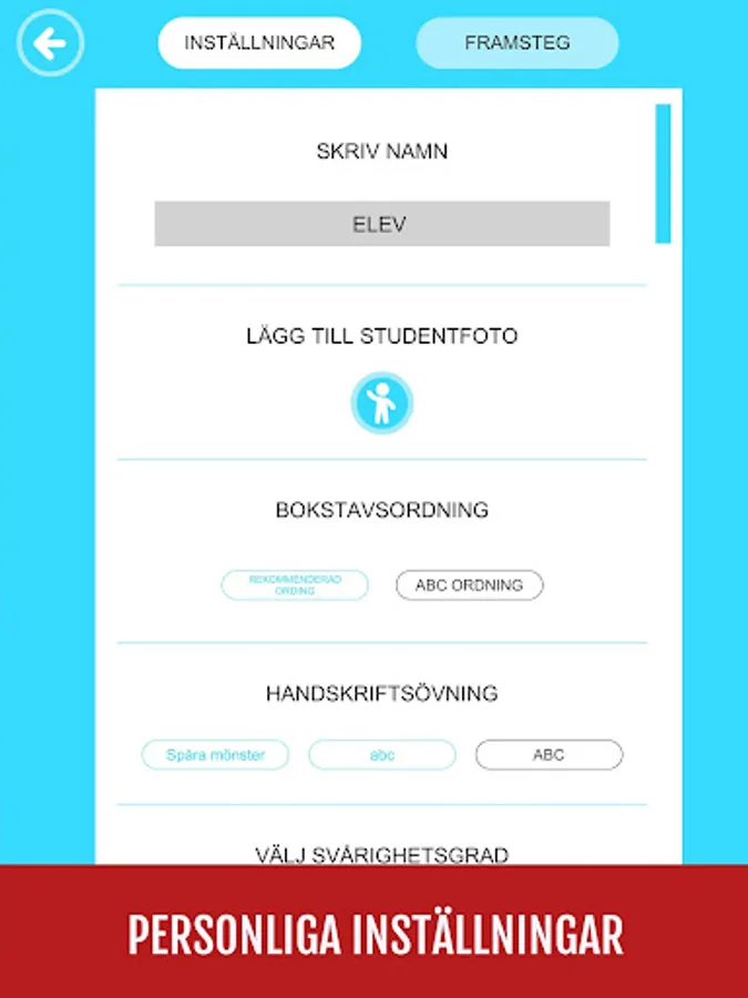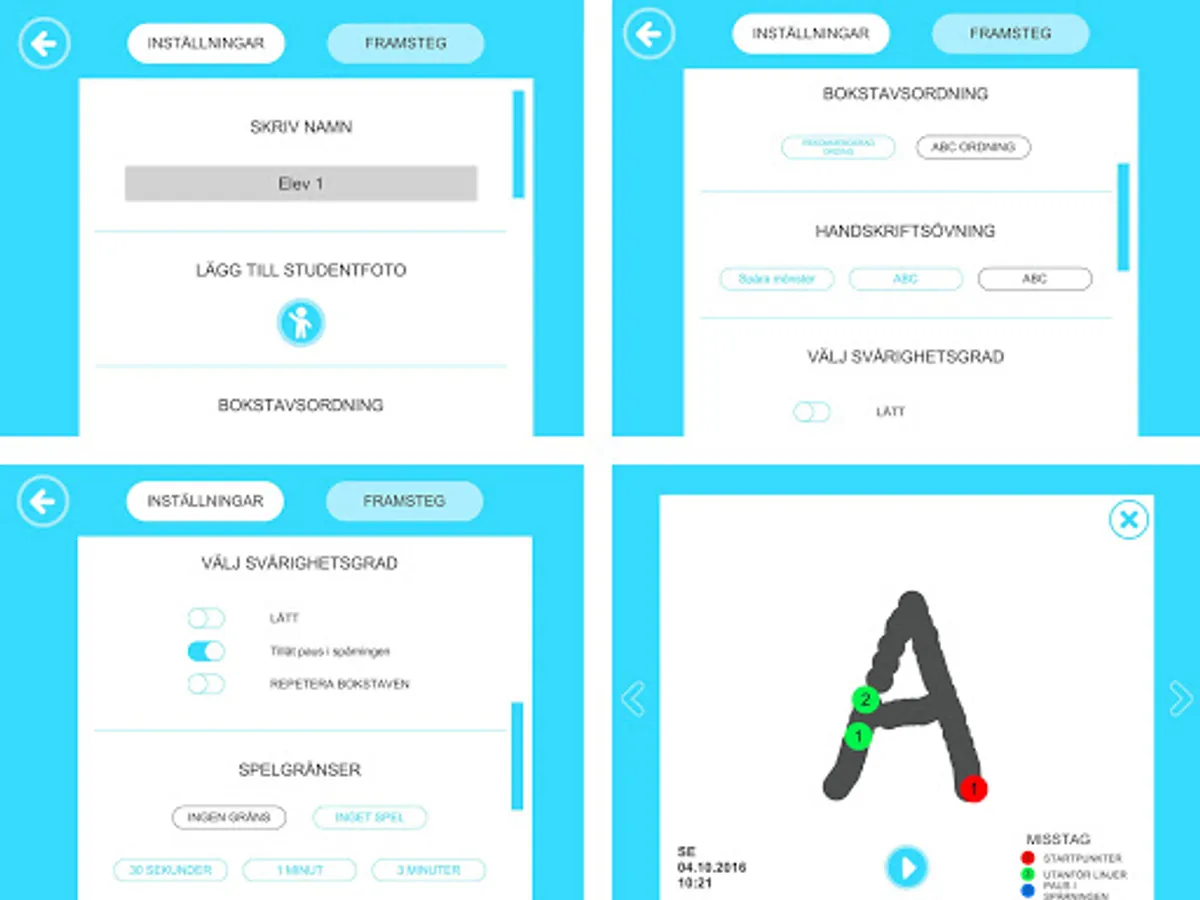 • Varying levels of difficulty where the urging and assistance gradually decreases every time. In step one DTE important to find the starting point, in step two shall keep within the lines, and in step three should be able to write the letter correctly (with all segments in the right order) without your finger leaves the screen.