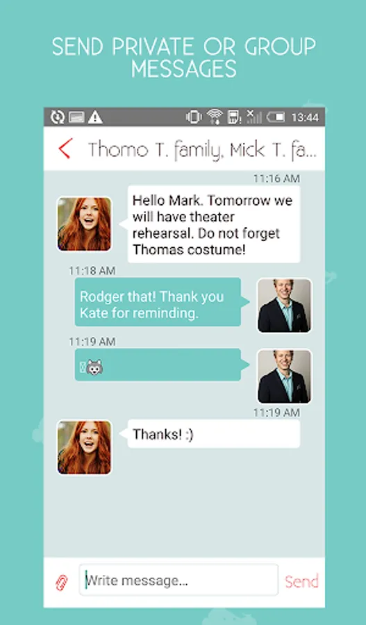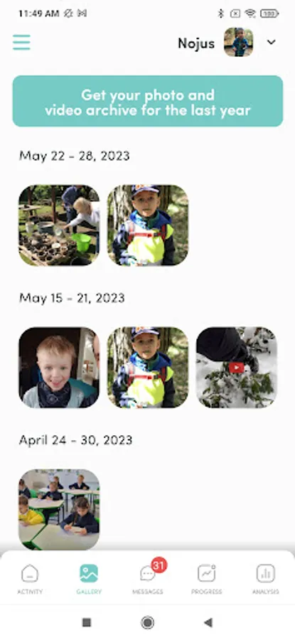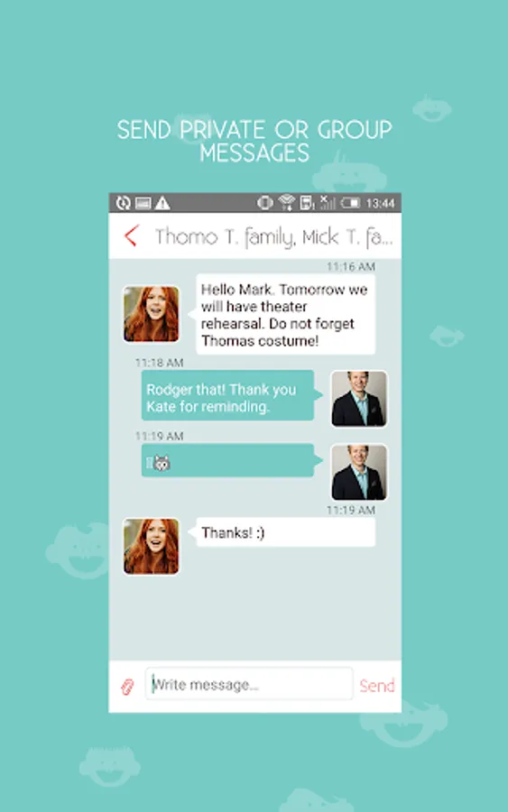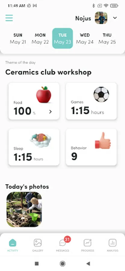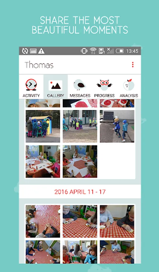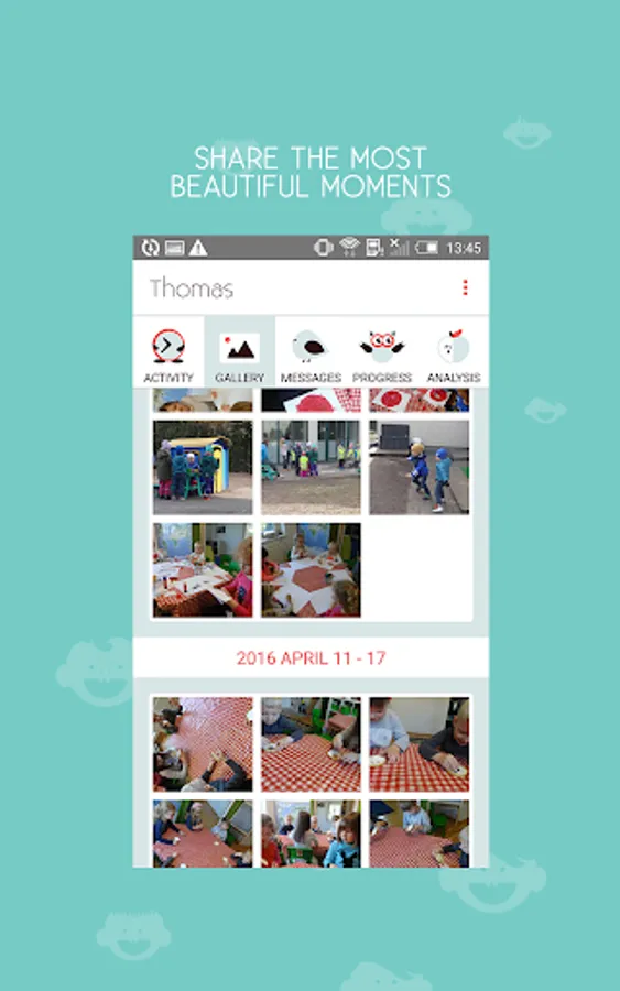 • share the best moments: sending photos/videos of individuals and groups, keeping photos in child photo gallery;