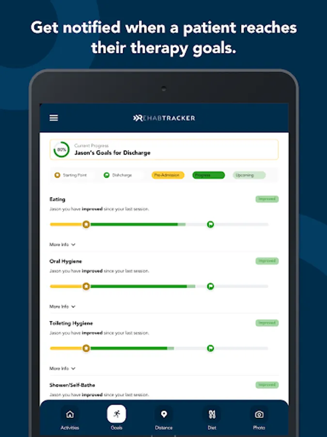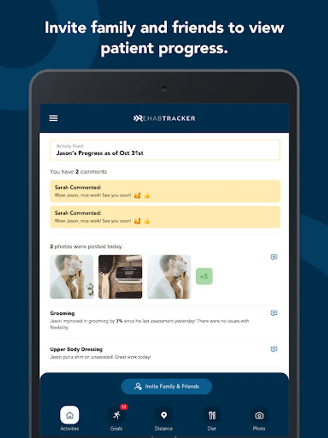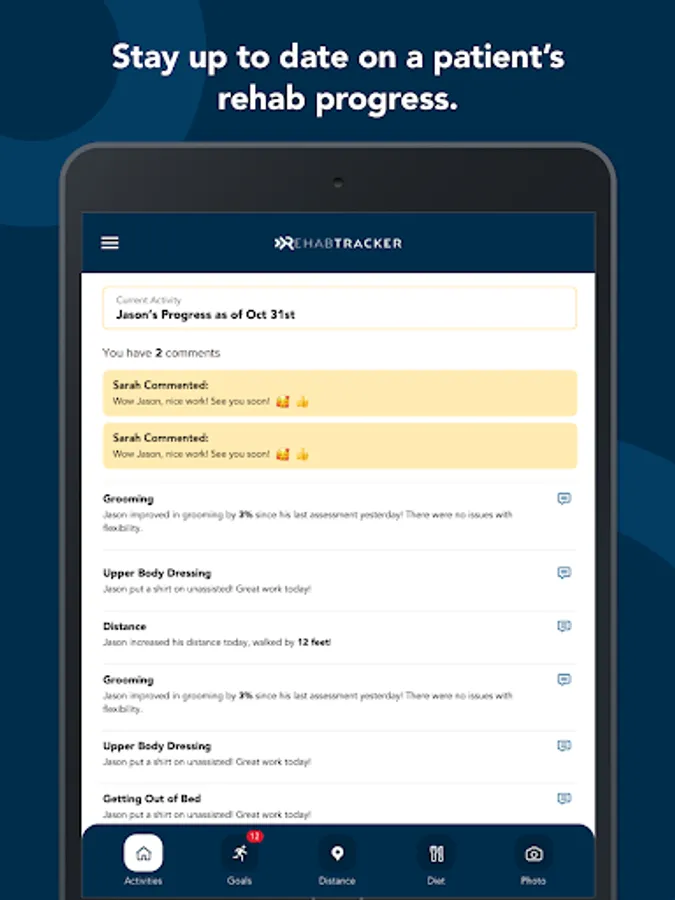 During the course of treatment, therapists set goals with patients and enter updates about their progress during therapy sessions. Patients and family members receive real-time updates through RehabTracker, involving everyone in the recovery process and increasing the likelihood that patients return home safely.