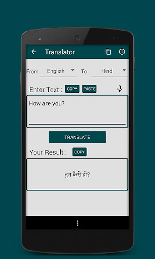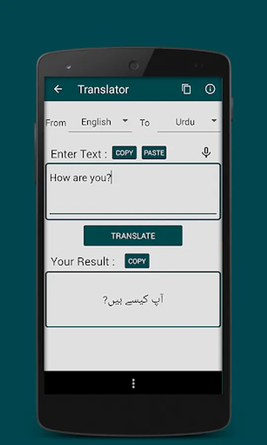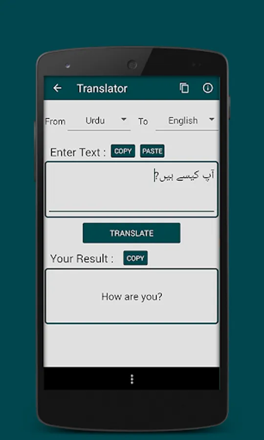 - Copy and Paste features. You can copy the translated text Urdu, Hindi or English, and use it anywhere you want.